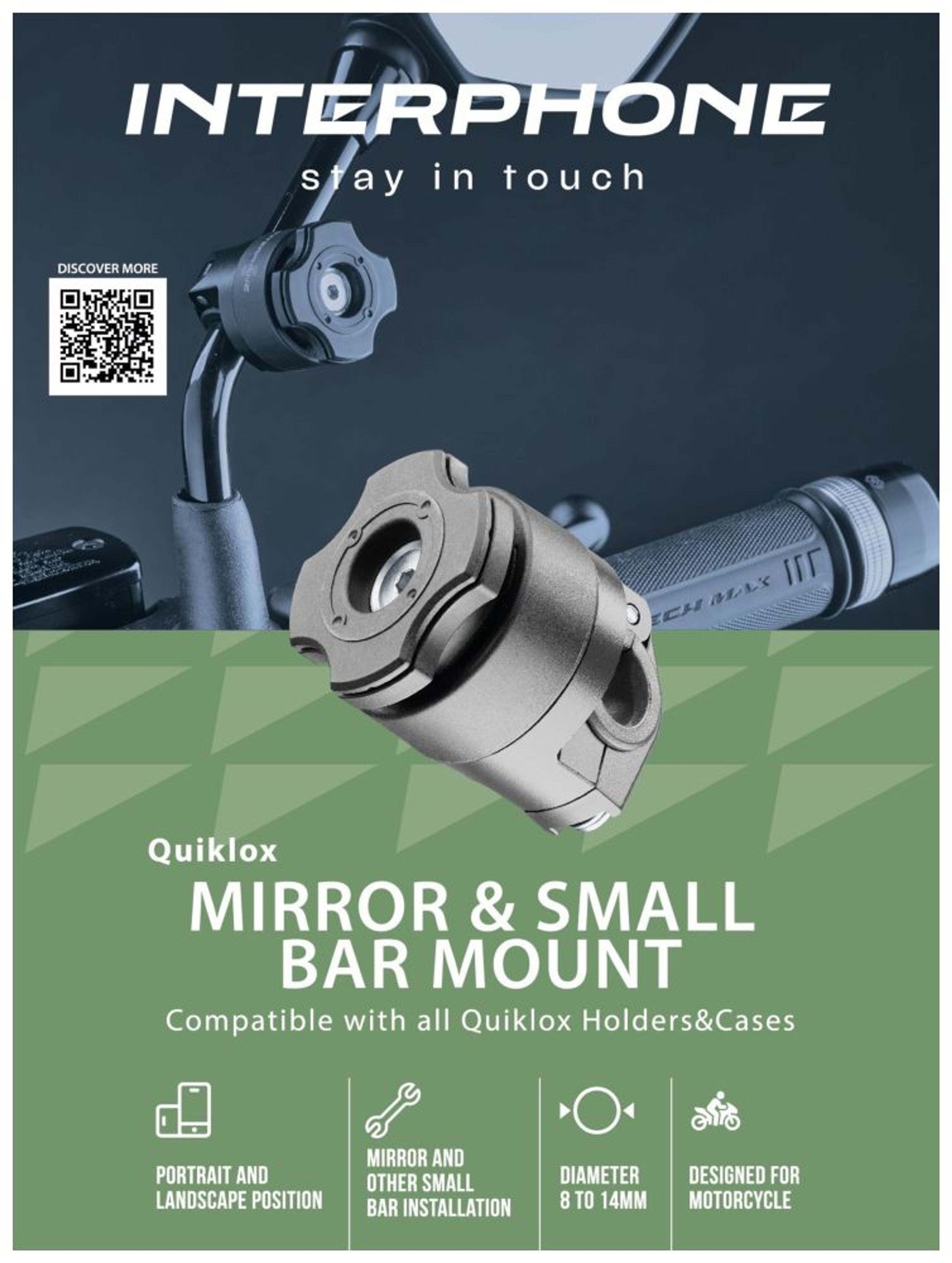Univerzální úchyt Interphone Quiklox na zrcátko nebo hrazdu motocyklu je kompatibilní se všemi držáky telefonu Quiklox. Orientace telefonu na šířku nebo na výšku. Anti-release systém zabraňující náhodnému odpojení.