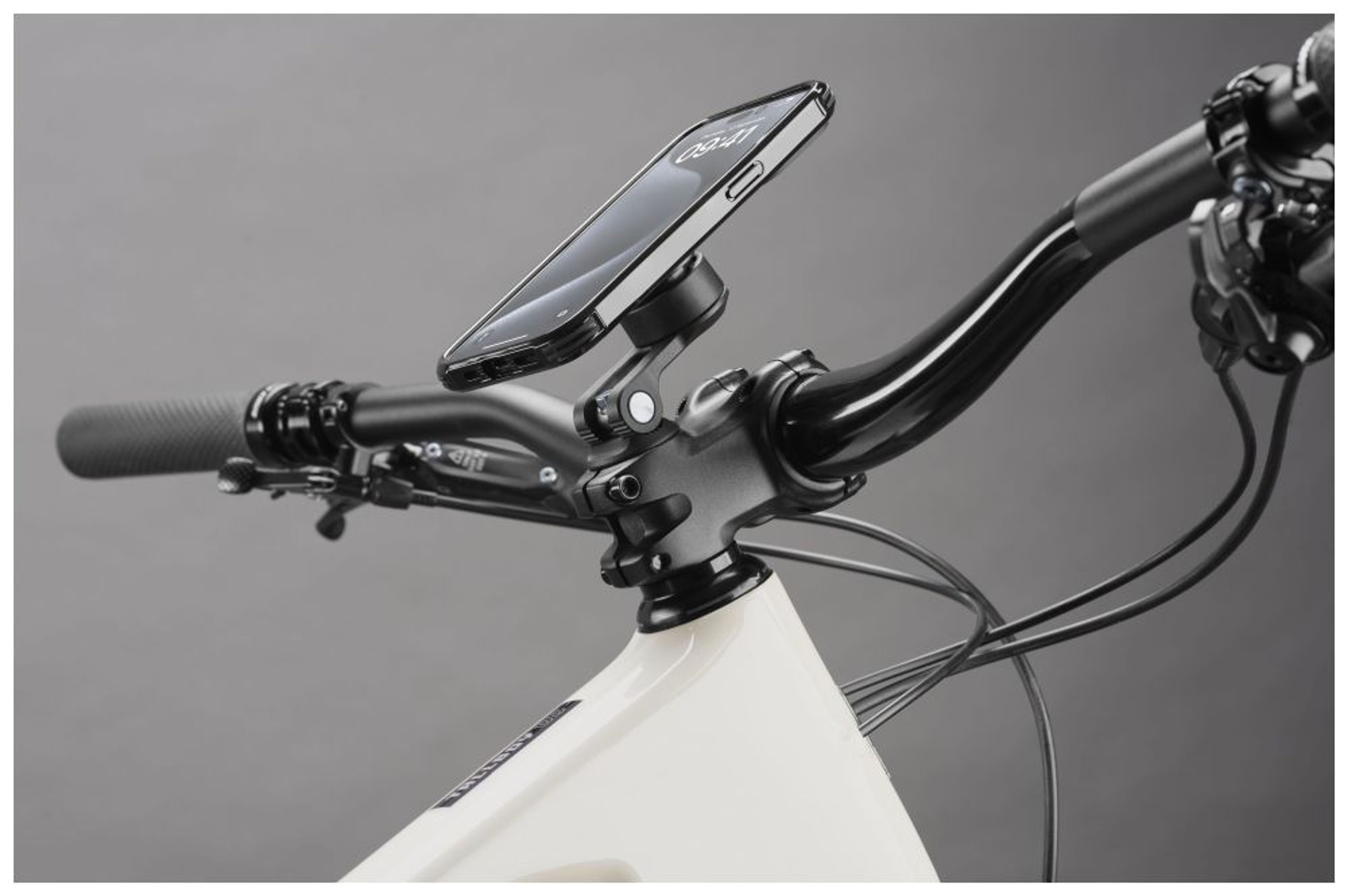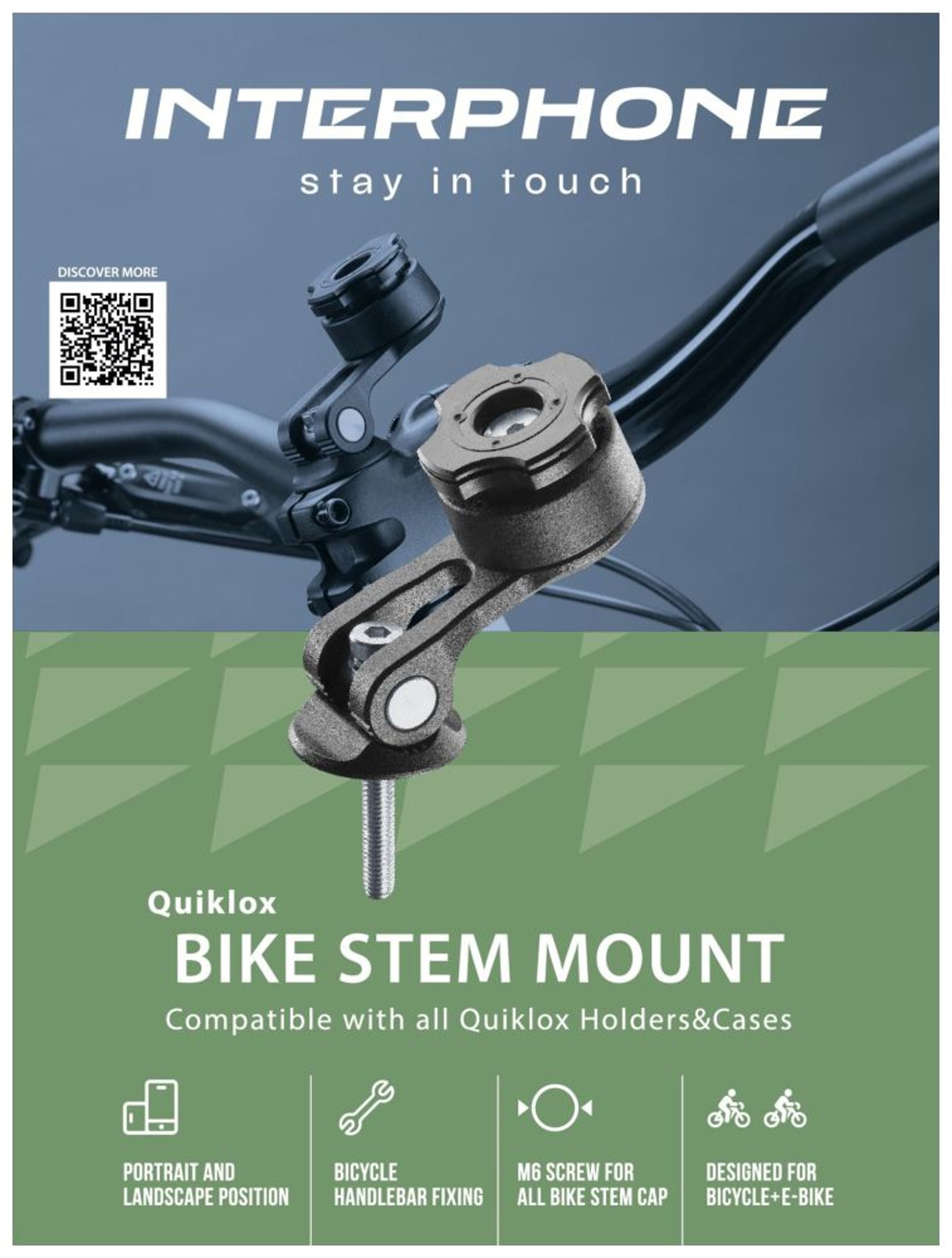 Univerzální úchyt Interphone Quiklox pro kolo do krku řídítek je kompatibilní se všemi držáky telefonu Quiklox. Orientace telefonu na šířku nebo na výšku. Určeno pro jízdní kola a elektrokola. Anti-release systém zabraňující náhodnému odpojení.