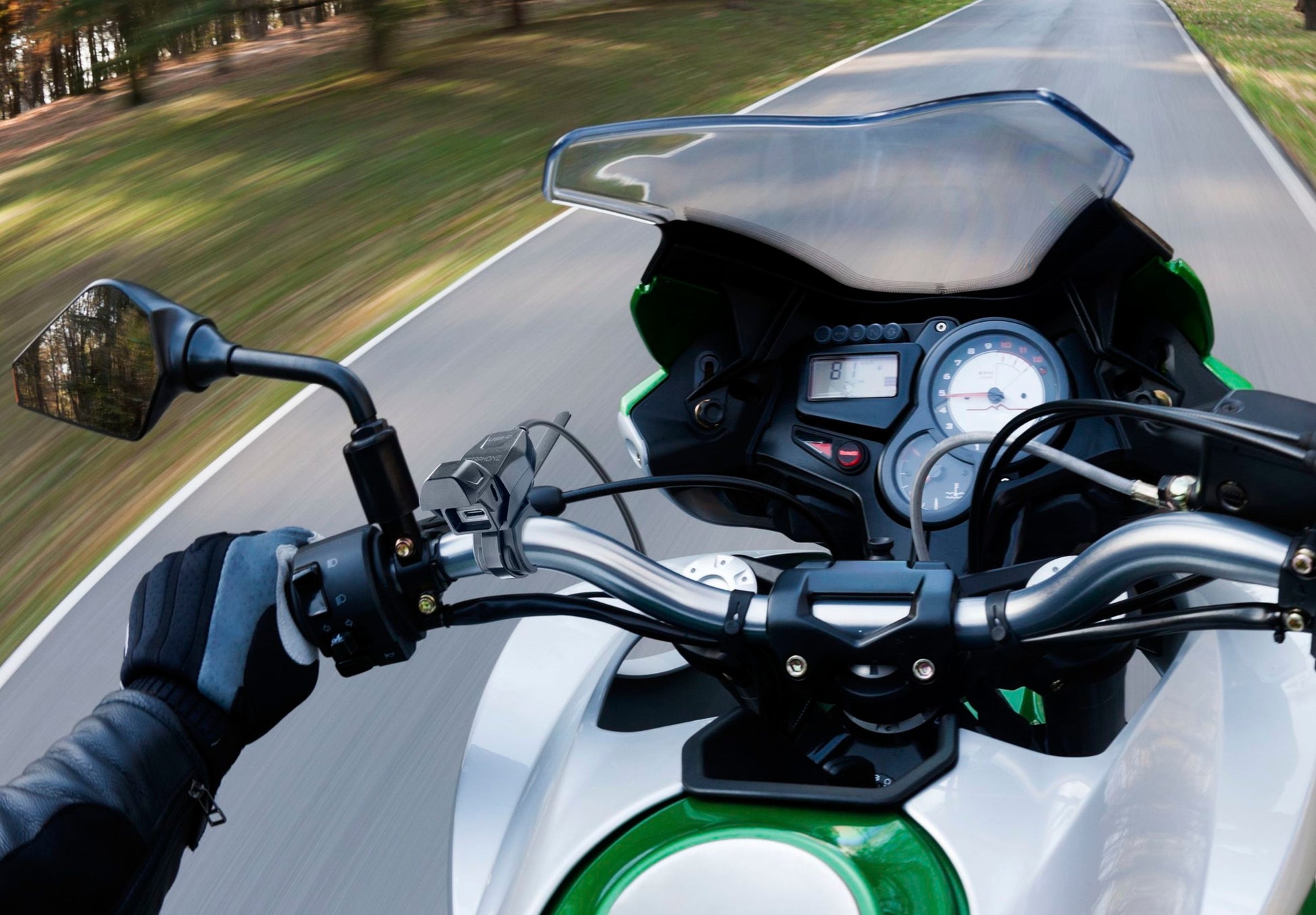 Systém napájení na řídítka motocyklu. Zásuvka USB-C s možností přerušení odběru proudu při zavřené krytce.