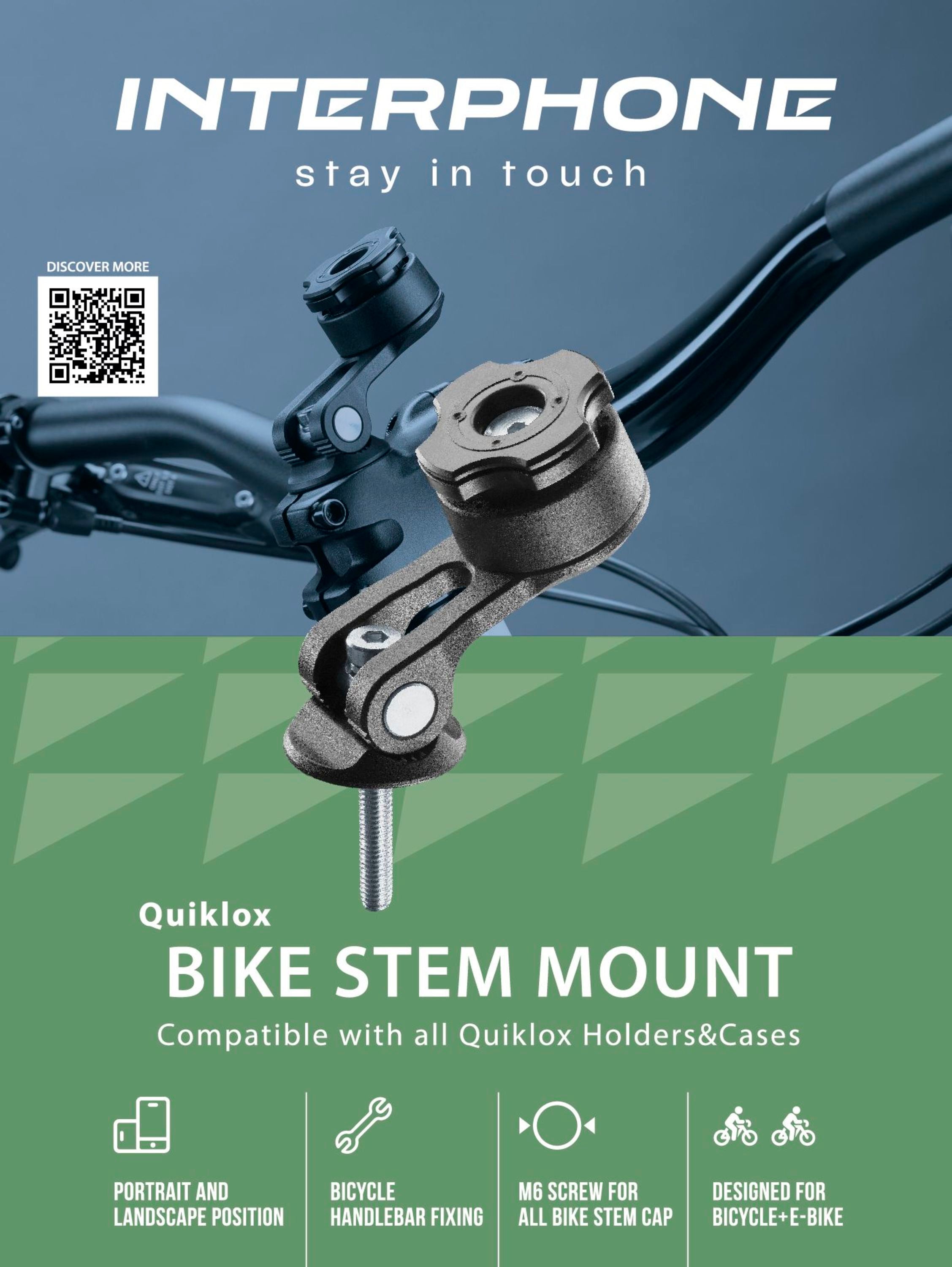 Univerzálny úchyt Interphone Quiklox pre bicykel do krku riadidiel je kompatibilný so všetkými držiakmi telefónu Quiklox. Orientácia telefónu na šírku alebo na výšku. Určené pre bicykle a elektrobicykle. Anti-release systém zabraňujúci náhodnému odpojeniu.